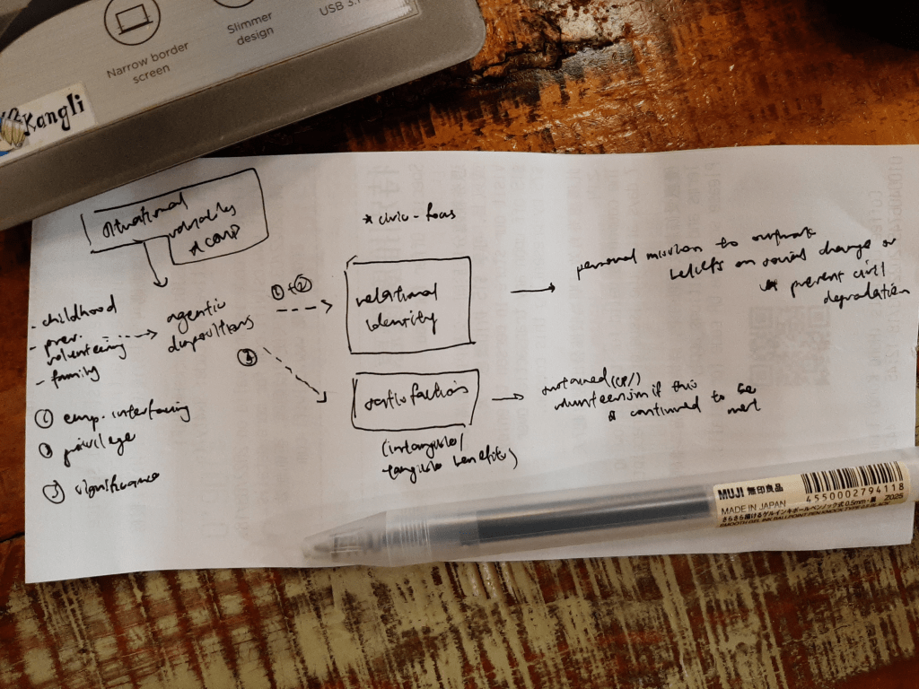 - Receipt theorising (or, whatever works): While ATLAS.ti is helpful, some of the foundational elements of my emergent theory had its humble beginnings on receipt paper. The beauty of receipt theorising is that, because the receipt paper was meant to be thrown anyway, it somehow facilitates my brainstorming. With no ideas set in stone and the openness to try and see if that fits the data. I especially love diagramming and below is how I tried to integrate the emerging theory with the extant frameworks: