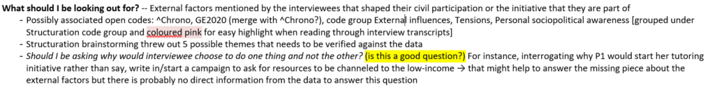 - Distance: Both in terms of time and psychological attention. While too many other tasks depletes the cognitive bandwidth, having some tasks unrelated to the research helped me to relook at the data with fresh eyes. GTM is a create-tive process, and so at times when I feel like I have nothing to give anymore, I would perhaps read up journal articles related to my research interests. Sometimes the ideas presented actually helps me to draw links between the emerging themes!